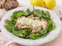 サラダの上に載せてパンを添えると、カフェ飯のようなヘルシーランチに。レモン汁は、生のレモンを搾ったものを使用すると、味も香りも格段に上がります。