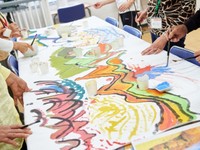 参加者たちが口々に褒め称えるのは、たったいま制作したテーブルクロスのアート作品。「芸術療法」で完成後に全員が作品を前にして語り合うギャラリートークでの一コマです。