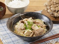 - 豆腐は8等分にし、豚こま肉はたべやすい大きさに切る。ナガネギは5mm幅の斜め切りに。シメジは石づきを取って小房に分ける
