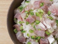デイサービスでは生魚は出なかったので、ときどき丼物にしたり、刺身や漬けにすると喜んでくれました。あじの刺身と相性がいいピーマンを、一緒に合わせてどんぶり料理に。あじをさっと酢にくぐらせて、におい消しをして食べやすくします。
