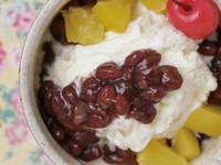 - 器にアイスクリーム、3の煮小豆(適量)、黄桃、さくらんぼを盛りつける
