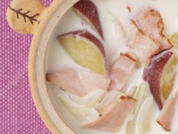 さつまいもの甘みをじんわり感じる秋のスープです。さつまいもは細長いもののほうが糖分を蓄えており、甘みを感じやすいといわれています。いも類がモソモソして食べにくい人も、スープにするとやわらかくなり食べやすくなります。