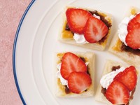 - パイ生地につぶあんとホイップクリーム、へたを除いて薄切りにしたいちごをのせる