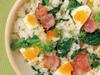 - ごはんに1のベーコンとフライパンに残った焼き汁、半熟卵、しょうゆ、塩を混ぜ合わせ、菜の花を加えてさっくりと混ぜる