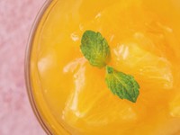 ビタミンカラーで、見るだけで元気が出てくるオレンジ色のゼリーです。高齢になるとかためのゼリーは食べづらいこともあるので、やわらかい食感にしました。果肉を加え、つぶつぶ感も楽しみます。
