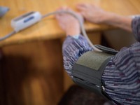 施設に到着すると、すでに診察は始まっていて、義母は血圧測定の真っ最中。わたしたちの姿を見つけた義母は「ここよ~!」と、手をブンブン振って合図してくれます。おかあさん、それ、血圧がちゃんと測れなくなるやつ……! 案の定、とんでもなく高い数値が出て、看護師さんも苦笑い。