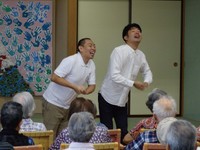 「あるある探検隊」のリズムネタで一世風靡したお笑いコンビ・レギュラーの松本くんと西川くんは、いま全国の介護施設をまわって、お年寄りたちを笑顔にする活動をしています。ところがここ数ヶ月、世界的に蔓延する新型コロナウィルスの影響で、思うように活動ができません。感染防止のため外部との接点を遮断された施設の利用者たちのストレスも心配です。実はこういうときこそ、介護レクリエーションの出番。施設でも家庭でも、簡単にできて、みんなが楽しめる2人の極意をお教えしましょう!
