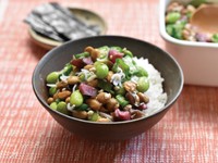 今回は、冴え冴えとした緑色の冷凍枝豆と冷凍おくらを、発酵食品の納豆と混ぜ合わせた「彩り元気納豆」を紹介します。しば漬けを加えて、炊きたてのごはんに載せれば、見た目もきれいで食欲アップ! しっかりと嚙むことになるので、シンプルな納豆ごはんよりも満足感が得られます。ごま油の油分でなめらかになり、風味も増すのでごはんが進みます。