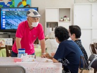 午前10時30分から血圧測定、ラジオ体操などが始まりますが、その前後の時間でみなさんおしゃべりに花を咲かせます。岸岡さんは笑い声が絶えない各テーブルを回りながら地域の高齢者たちと会話を交わしていました。