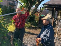 到着して柿の木を見上げると、相当上のほうにしか柿がありません。そこで高枝切り鋏の登場。