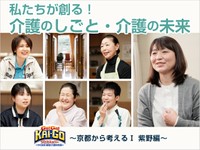 介護の仕事は今、ダイバーシティーの最先端でもあります。多様な世代が多様な働き方をし、その働きやすさが人材を集める好循環と利用者の満足度の向上を生み出しています。京都福祉サービス協会の高齢者福祉施設「紫野」で、特別養護老人ホームやデイサービスの仕事をしている5人のスタッフに、5年後や10年後の介護や自分が理想とする介護、これからやってみたい介護について語ってもらいました。(ポートレート用写真の撮影のとき、マスクを外して撮影しました)