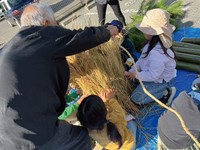 園児たちに藁を押さえてもらい、その上からメンバーさんが「括(くく)るけん、よぉに持っとれよ」と縄で括り付けていきました。
