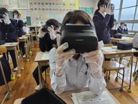 市と連絡会は構成も工夫しました。1コマ目に連絡会による認知症の基礎知識が楽しく学べるクイズ形式の講座を実施。2コマ目は「認知症VR体験会」です。生徒が先に基礎知識を踏まえていることを前提に、認知症のある本人が思いを語るインタビューを聞いてもらったうえで、VR体験に臨みました。初めてVRヘッドセットに触れる生徒が多く、みんな興味津々。生徒の一人は「階段を下りる」を視聴して「階段を下りるのは大変。お年寄りがためらう理由がわかった」と話しました。