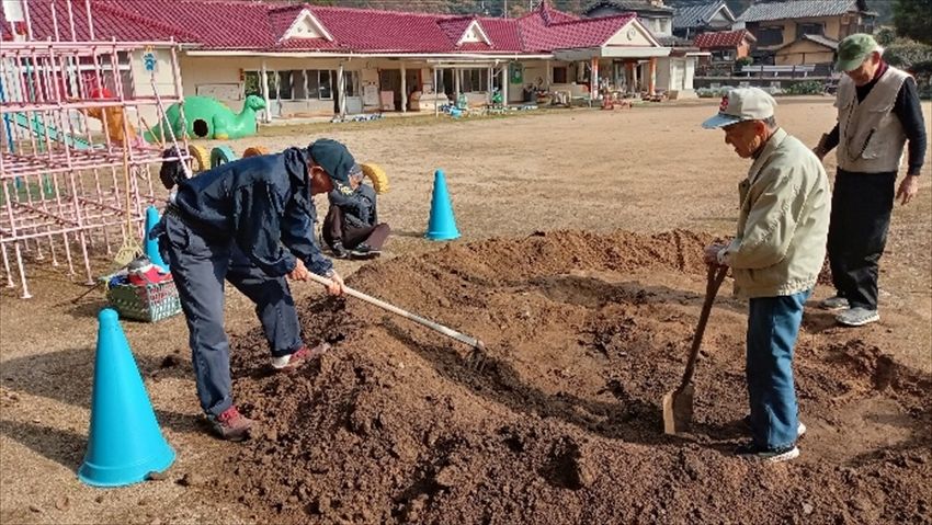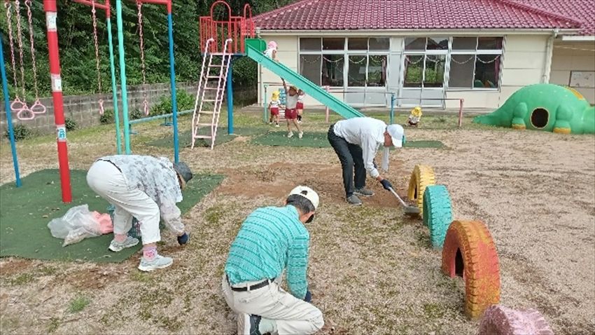 現在、園内の草とりや落ち葉拾いを中心にボランティアとして社会参加活動に取り組んでいます。幼稚園はどうしても男手が足りないからと、年間の一大イベントである焼き芋行事で使用するための穴掘り作業を頼まれたこともあります。「草取りは昔からしてきとるからなんぼでもできるで!」「道具が足らんから次は家から鍬を持ってくるわ!」と、意気込むメンバーさんもおられます。最初は見ず知らずの私たちに近寄ってこなかった園児たちも、今では慣れて挨拶をしてくれたり、自分のことを話してくれる子もいます。そんな中、いつもお世話になっているおじいちゃんおばあちゃんへと、園児たちからダンスのプレゼントを披露してくれました。メンバーさんにとっても園児たちにとっても、その日は少し特別な時間であったように感じます。